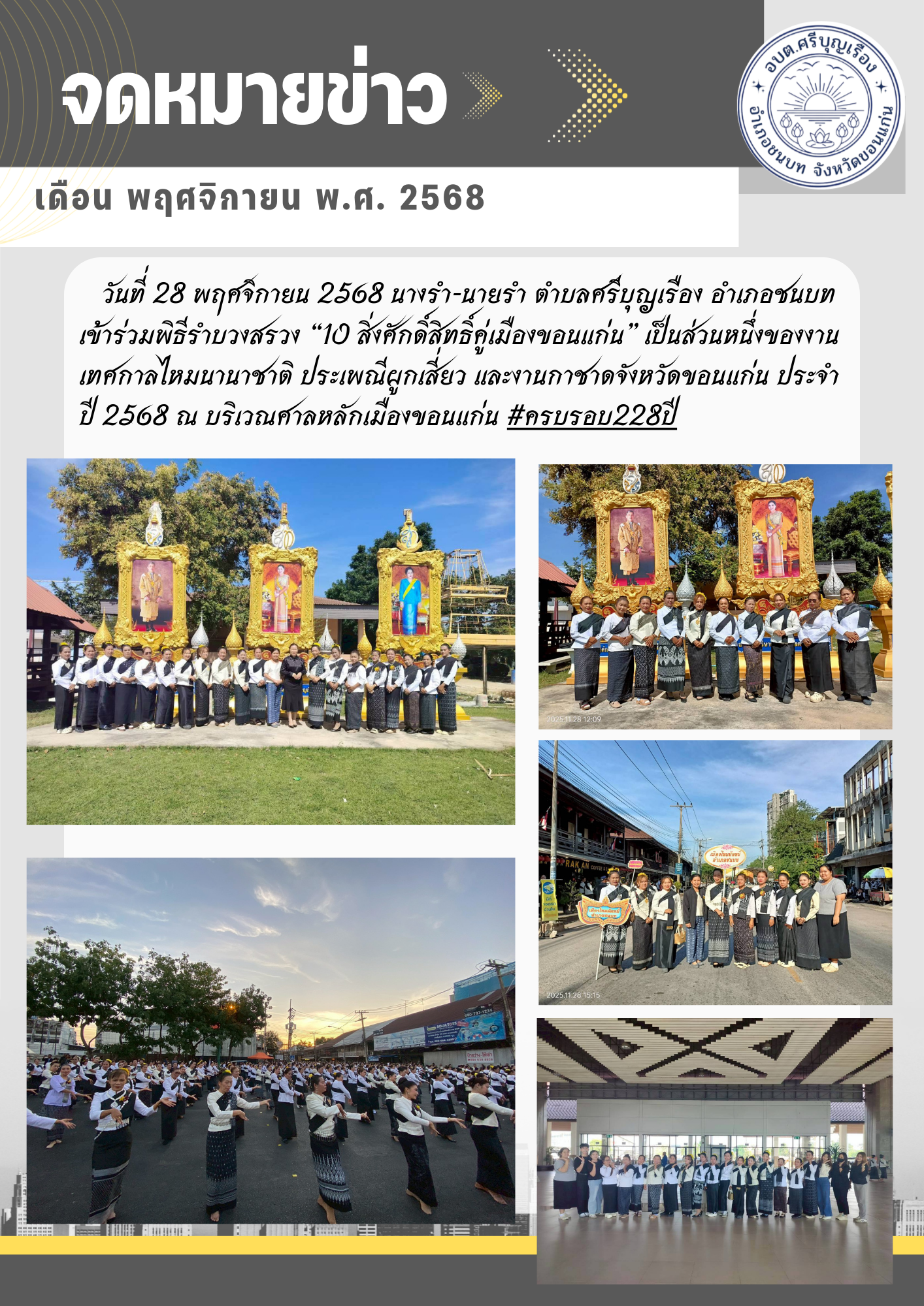 วันที่ 28 พฤศจิกายม 2568 นางรำ-นายรำ ตำบลศรีบุญเรือง อำเภอชนบท พักร่วมพิธีรำบวงสรวง "10 สิ่งศักดิ์สิทธิ์คู่เมืองขอนแก่น" เป็นส่วนหนึ่ขอยาม เทศกาลไหนานาชาติ ประเพณีผูกเสี่ยว และงานกาชาดจังหวัดขอนแก่น ป