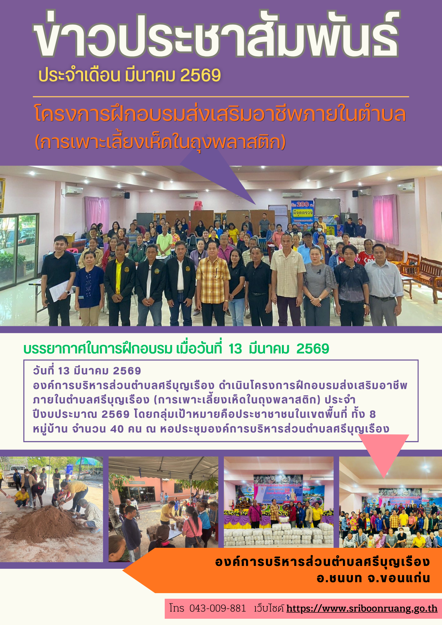 วันที่ 13 มีนาคม 2569 ประชาสัมพันธ์โครงการฝึกอบรมส่งเสริมอาชีพภายในตำบล (การเพาะเลี้ยงเห็ดในถุงพลาสติก)