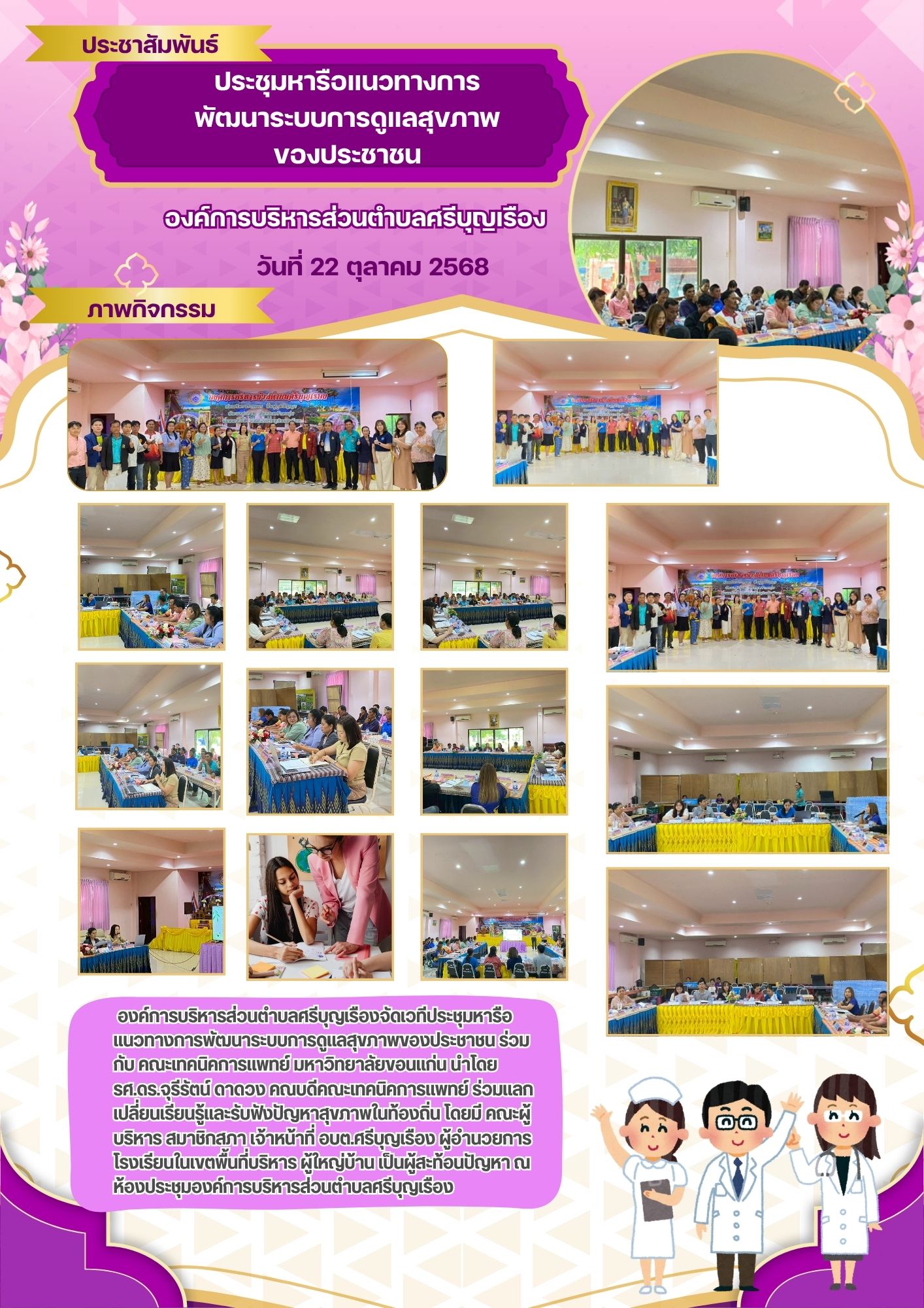 องค์การบริหารส่วนตำบลศรีบุญเรืองจัดเวทีประชุมหารือแนวทางการพัฒนาระบบการดูแลสุขภาพของประชาชน ร่วมกับ คณะเทคนิคการแพทย์ มหาวิทยาลัยขอนแก่น นำโดย รศ.ดร.จุรีรัตน์ ดาดวง คณบดีคณะเทคนิคการแพทย์ ร่วมแลกเปลี่